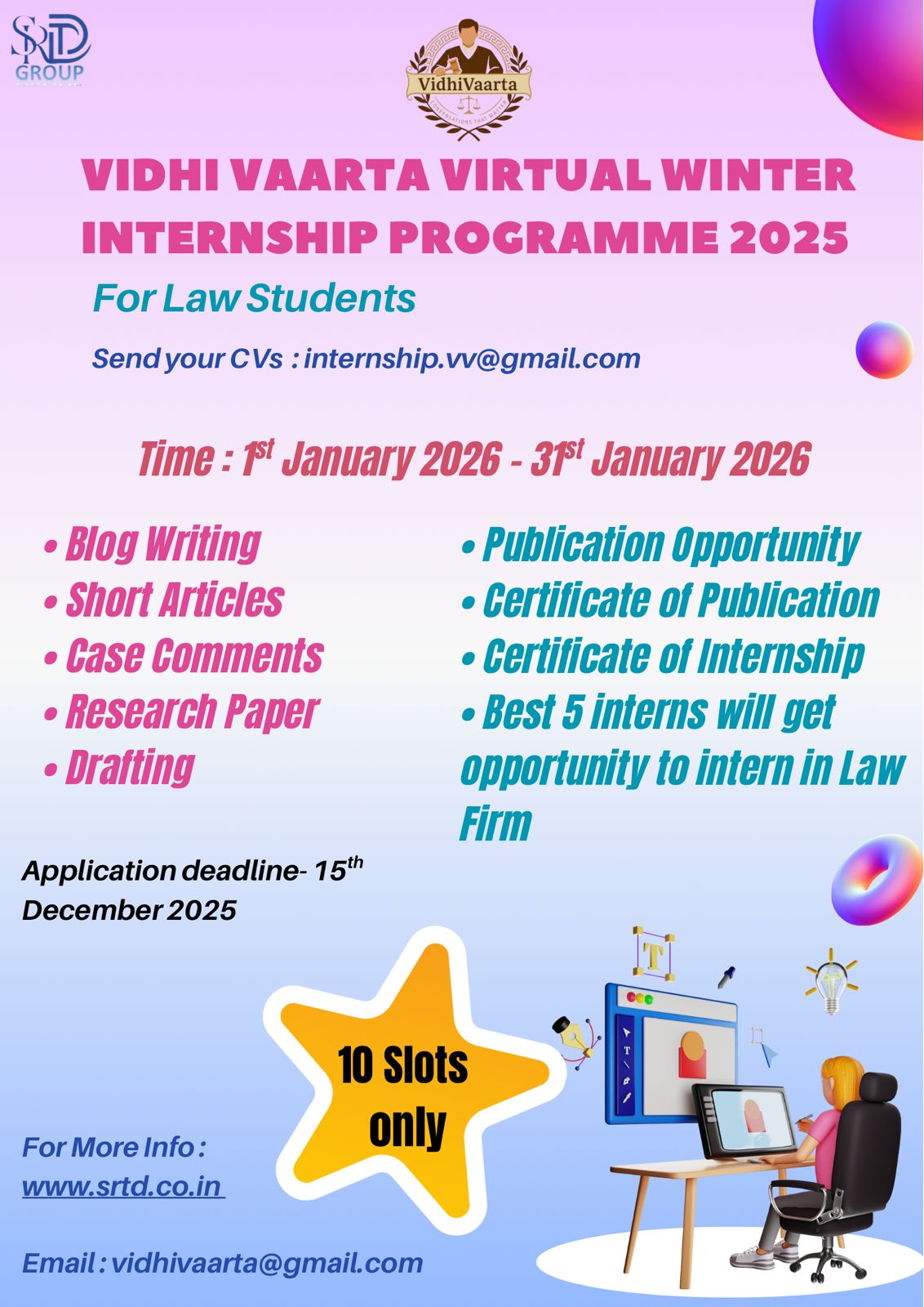 Vidhi Vaarta invites applications from law students across India for its prestigious Virtual Winter Internship Programme 2025. This one-month intensive research and writing-oriented internship is designed to provide practical exposure, enhance legal research and drafting skills, and offer publication opportunities.